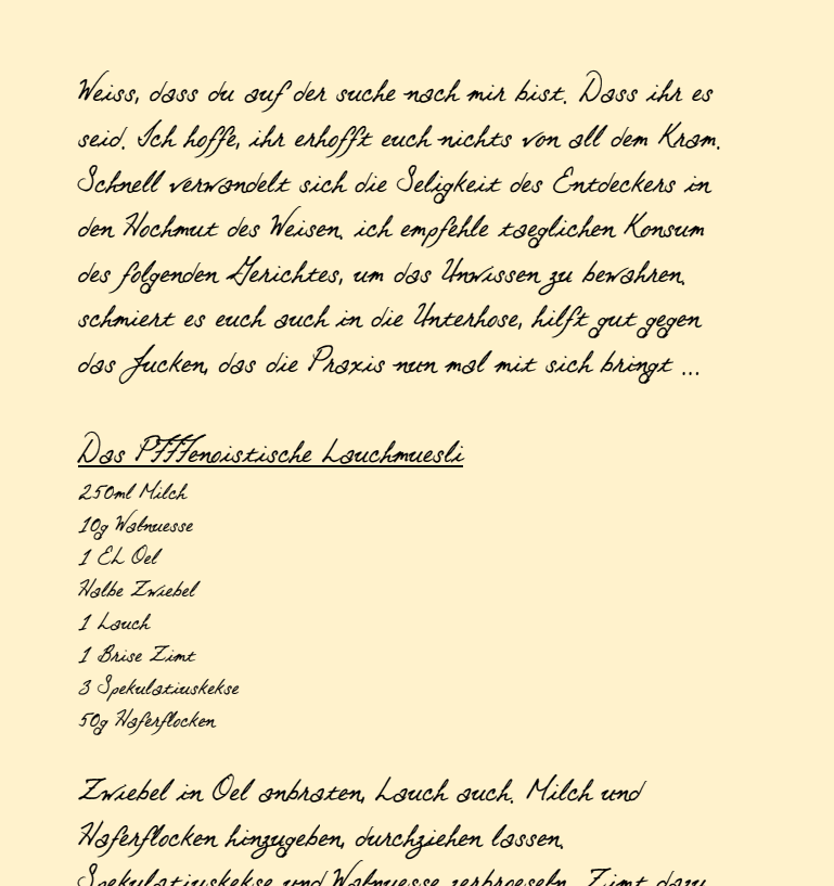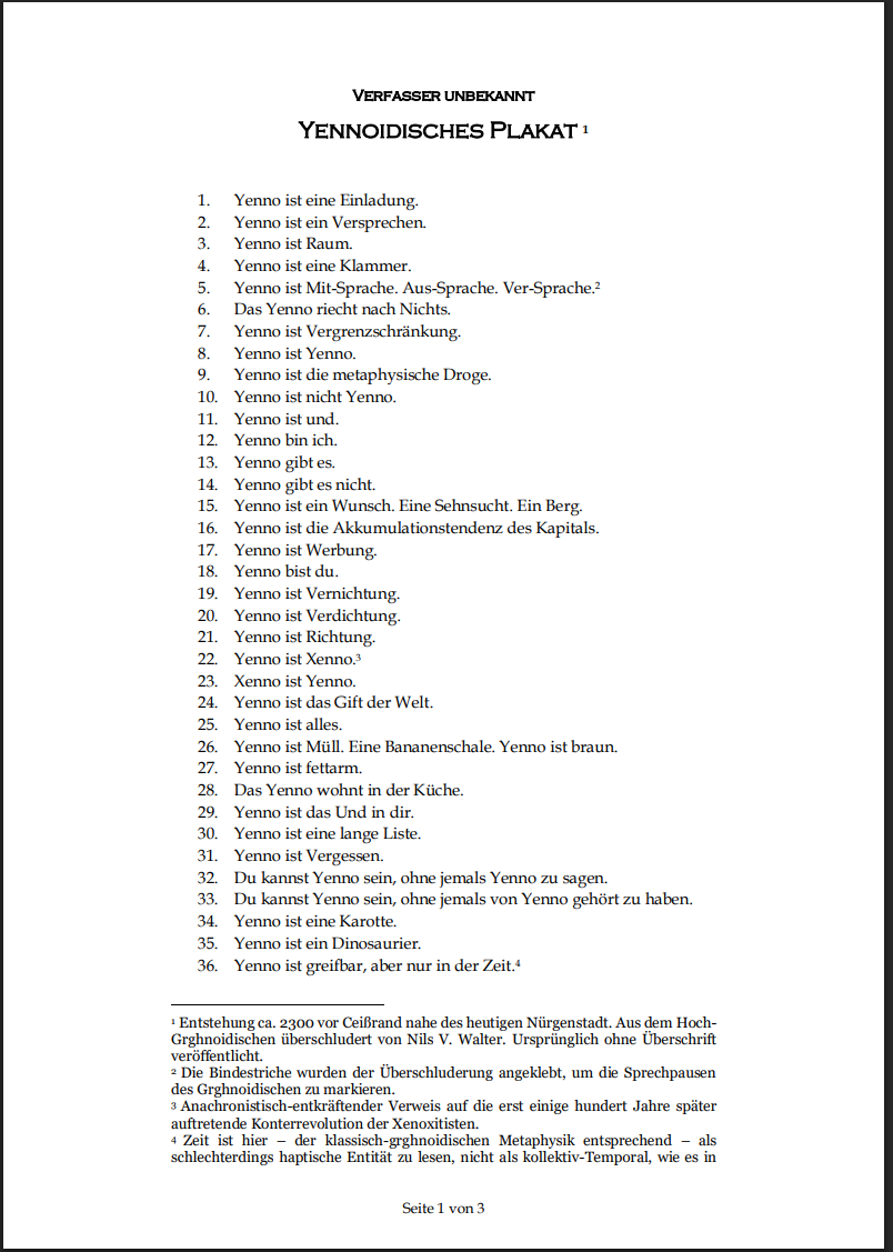 A confused letter from the brink this is. I guess it is not one to stand outside of yennoism as much as it may try to do so. The only answer I can think of to the question of the vegan wurst-salad: the question itself ...What is the meaning of the vegan wurst-salad? -- Erring. I hope that you can recognize an erring-as-erring throughout these pages. I am aware that the terms are fragile, the thoughts too large, too small, I cannot muster anything better. It is an imposition even to myself, I'd rather throw it all to the flames. If not for my faith: That plants grow better the more eagerly dig the worms.